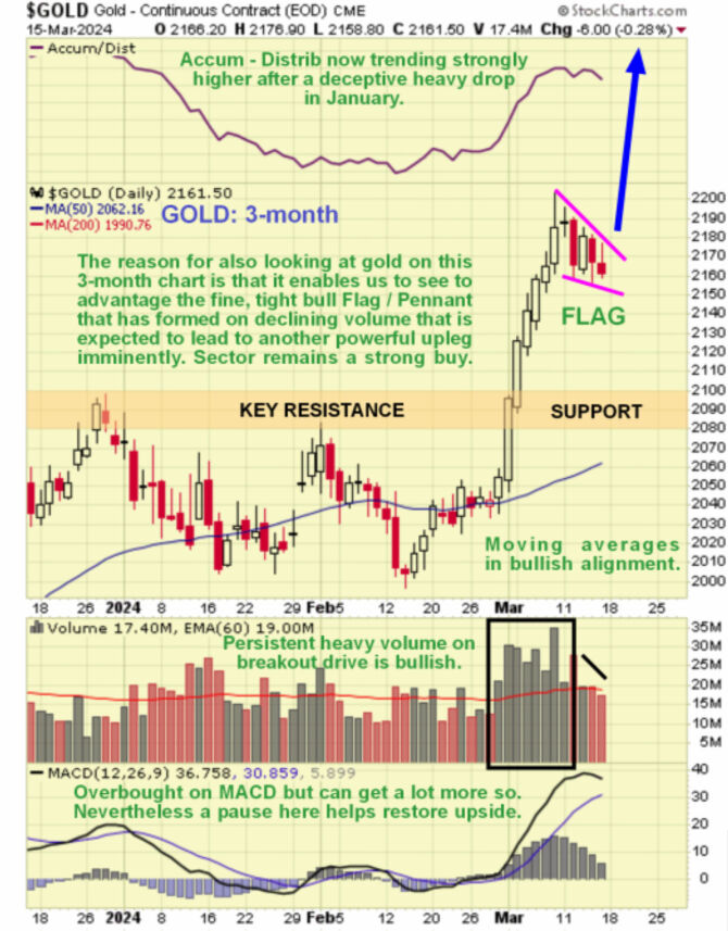 We will now proceed to look at gold again, this time on a shorter-term 3-month chart, the reason being to examine the price / volume action this month in an effort to determine what is going to happen next. The pattern that has formed as the price has reacted back slightly does not look like a top–price / volume action. It strongly suggests that it is a bull Flag / Pennant that will be followed by another strong upleg, similar in magnitude to the one that led into it and perhaps even stronger as gold is now in "open country" and moving away from the gravitational pull of the giant trading range.
