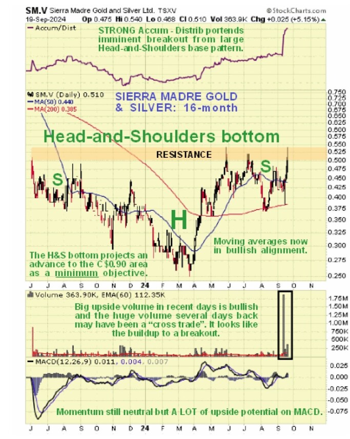 Turning to the stock charts for Sierra Madre we see that they look entirely positive, which is hardly surprising given the positive track that the company is on against the background of a rapidly brightening outlook for gold and silver.