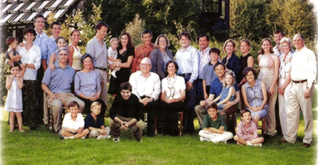 Here he is (center, white shirt) with his wife Nancy, their nine kids, and numerous grandkids: