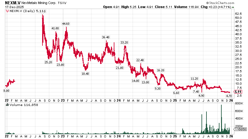 9. NexMetals Mining Corp. (NEXM:TSX.V; NEXM; NASDAQ) Can't really tell you much about this Botswana critical metals miner, except to say that it was a $50 stock 4 years ago and now it's a $5. No surprise it's now looking for a new CEO.