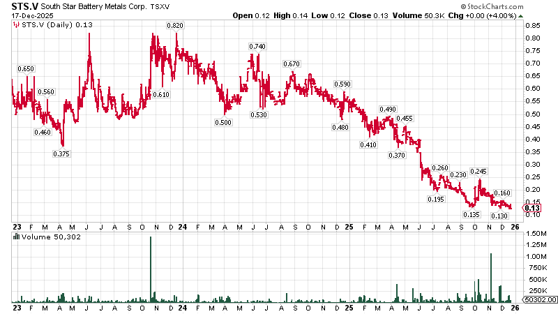 10. I really shouldn't be giving airtime to companies like this. It's too small and too illiquid. But South Star Battery Metals Corp. (STS:TSX.V; STSBF:OTCBB) has a humdinger of a chart and plenty of cash — this CA$14 million market company just completed a highly dilutive, full warrants and all, raise CA$6.7 million.