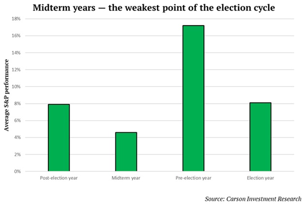 In the lead-up to the election, US stocks usually perform poorly. From January to October in midterm years, they drop an average of roughly 1%.