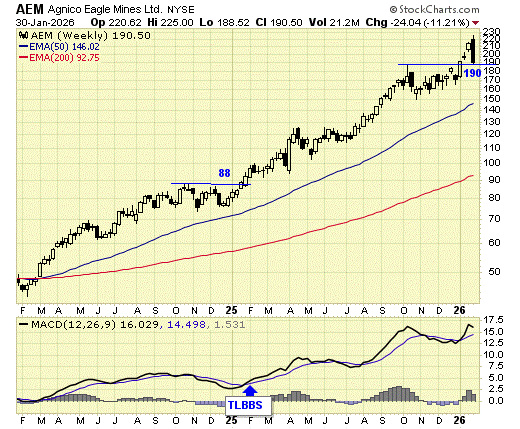 Agnico Eagle Mines Ltd. (AEM:TSX; AEM:NYSE) – exit on a weekly close below $190.