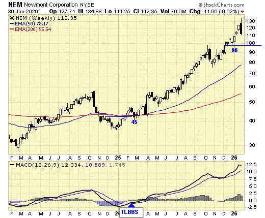 Newmont Corp. (NEM:NYSE; NGT:TSX; NEM:ASX) – exit on a weekly close below $98.
