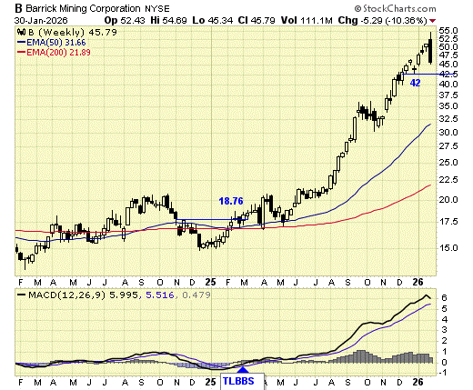 Barrick Mining Corp. (ABX:TSX; B:NYSE) – exit on a weekly close below $42.