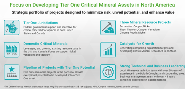 The company has now commenced diamond core drilling at the TITAC Project in Minnesota, targeting copper mineralization associated with the same intrusive package that already hosts a titanium dioxide resource. Management has described this as a systematic copper program, built around historic drilling that intersected copper but was not previously treated as the primary exploration focus.