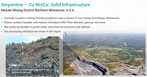 This part of Minnesota has a long mining history, and the critical advantage for any development story is infrastructure. Serpentine sits in a region with road, rail, and power access, plus an established labor pool, which is exactly what most copper juniors lack when they try to move from "resource" to "real project."