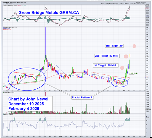 Green Bridge Metals spent most of 2025 in a corrective base after the 2024 spike. That type of long reset is often what you need before a new upleg can stick. The key technical development now is that the stock has pushed up through the Point of Recognition area and has already met the first two upside objectives at CA$0.20 and CA$0.30. With those levels achieved, the chart is now pointing toward the next logical resistance zone near CA$0.40 as the third target.