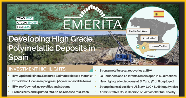 Emerita Resources Corp.'s (EMO:TSX.V; EMOTF:OTCQX; LLJA:FSE) flagship IBW (Iberian Belt West) project is hosted within the renowned Iberian Pyrite Belt in Western Spain, one of the most productive volcanogenic massive sulfide (VMS) terranes in the world.