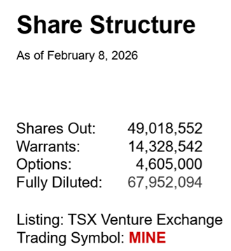 As of early February 2026, Inomin reports approximately 49 million shares outstanding, with warrants and options bringing the fully diluted total to just under 68 million shares.