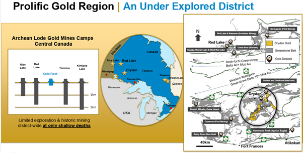 Dryden Gold is a district-scale, high-grade gold explorer operating in northwestern Ontario along the prolific Manitou-Dinorwic deformation zone. The company controls more than 702 square kilometers, or 70,250 hectares, of 100%-owned ground covering roughly 50 kilometers of strike length. This is not a single-zone story. It is a large structural corridor that has seen limited historic drilling and shallow historical mining, but has never been properly tested at depth.