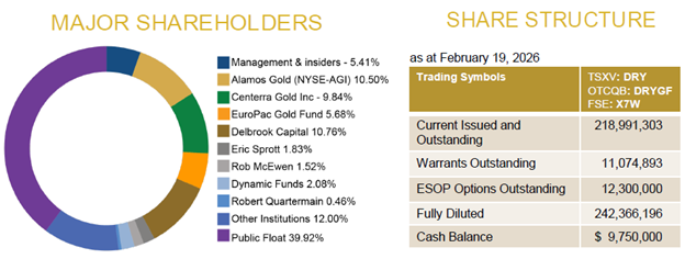 As of February 19, 2026, Dryden Gold had 218,991,303 shares issued and outstanding, with 11,074,893 warrants and 12,300,000 options for a fully diluted total of 242,366,196 shares. The company reported a cash balance of approximately CA$9,750,000.