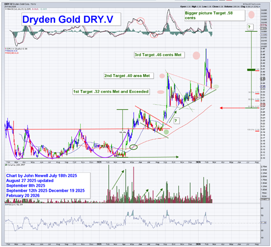 The updated February 20, 2026, chart reflects a stock that continues to respect its bullish structure. Since the initial breakout in May 2025, Dryden Gold achieved its first two technical targets at CA$0.32 and CA$0.40. The third target at CA$0.46 has now also been met, confirming that the broader uptrend remains intact.