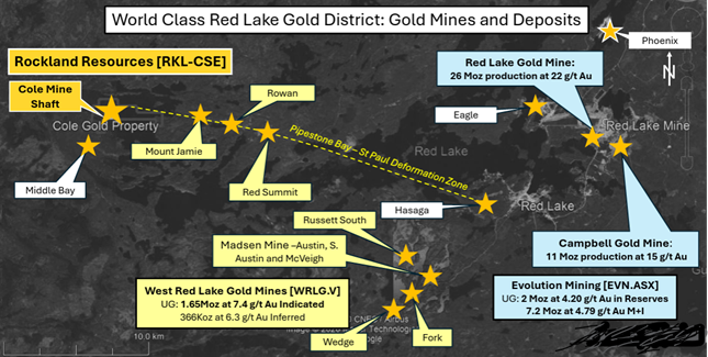 Rockland Resources Ltd. (RKL:CSE;BERLF:OTCQB;GB2:FSE) controls a past-producing, high-grade gold system in the heart of the Red Lake Mining District, one of the highest-grade gold camps in the world. The Cole Gold Project brings together intact underground development, dense multi-vein quartz systems with visible gold, confirmed depth extensions, and multiple drill-ready targets now being tested through a 3,000-meter program.