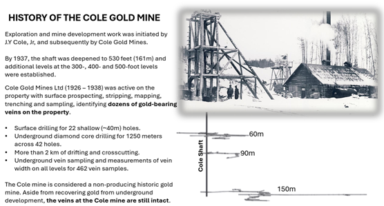 The Cole Gold Mine operated between 1926 and 1938. During that time, more than two kilometers of underground development was completed, including a shaft extended to 530 feet with levels established at multiple depths. Extensive trenching, mapping, sampling, and drilling identified dozens of gold-bearing quartz veins. Importantly, the veins remain intact.