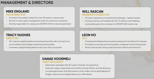 The broader advisory group includes senior geologists and mine development professionals with decades of operational and discovery experience. For a junior exploration company, the depth of experience on both the corporate and technical side is notable.