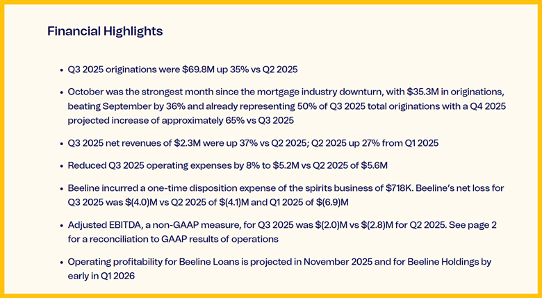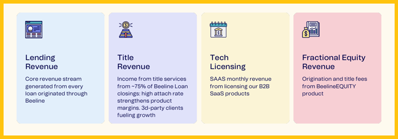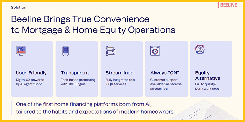Beeline Title: This in-house, fully digital B2B and B2C title service speeds up closings and improves margin. It's used in about 75% of Beeline loans and with outside B2B clients.
