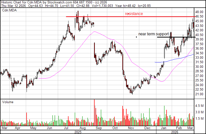 MDA Space Ltd.'s (MDA:TSX; MDA:NYSE) stock jumped up as high as CA$45.90 on the back of the NY IPO news and is back down today on a broad, steep market sell-off. Another chance to buy at a good price. That said, if the market continues a steep dive, there could be better buy prices ahead, near support.