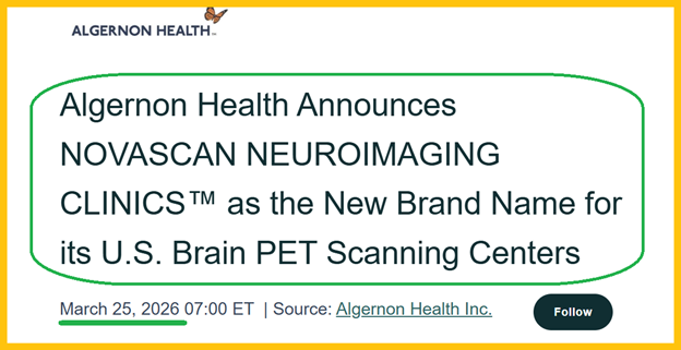 Algernon to Open the First Brain-Dedicated PET Scanning Clinic in the U.S. at the HCA Florida University Medical Office Building – Globe News Wire, March 23, 2026.