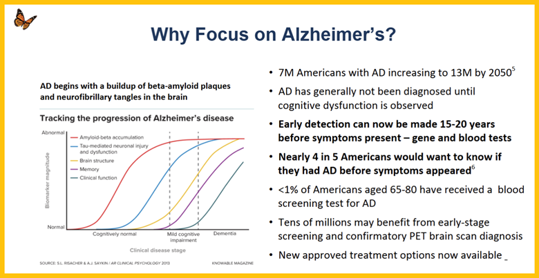 This plan will make the company's main business diagnosing Alzheimer's disease, using high-technology brain-optimized Positron Emission Tomography (PET) scans for diagnosis, with the goal of capturing a US$6.9 billion emerging market. Medicare, Medicaid, and private insurance will cover the cost for the patients, making the target market both enormous and enticing.