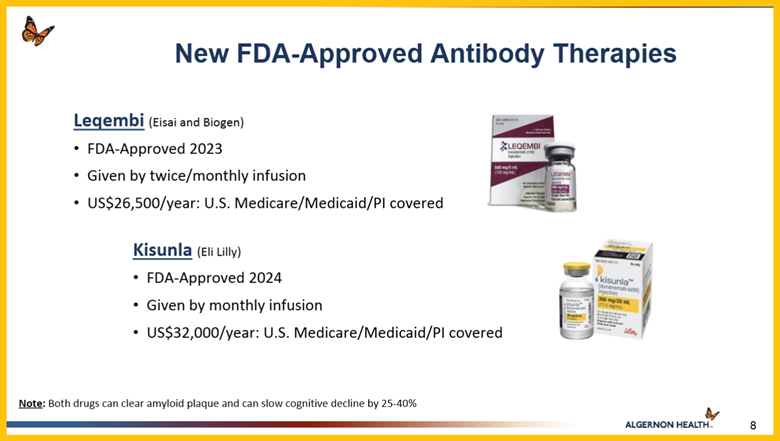 The FDA has approved two new AD antibody treatment therapies developed by Eli Lilly (Kinsula) and Eisai and Biogen (Leqembi). Both are covered by U.S. Medicare, Medicaid, and private insurance.