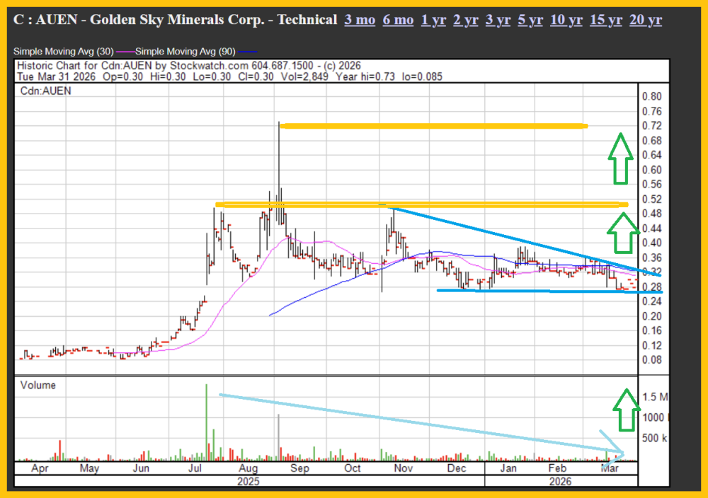 On April 1, 2026, technical analyst Stewart Thompson gave the following quote to Streetwise Reports: "For Golden Sky, price targets are CA$0.50 and CA$0.70. A burst in volume should confirm the end of the consolidation and a new bull phase with a breakout from the wedge-like drift."