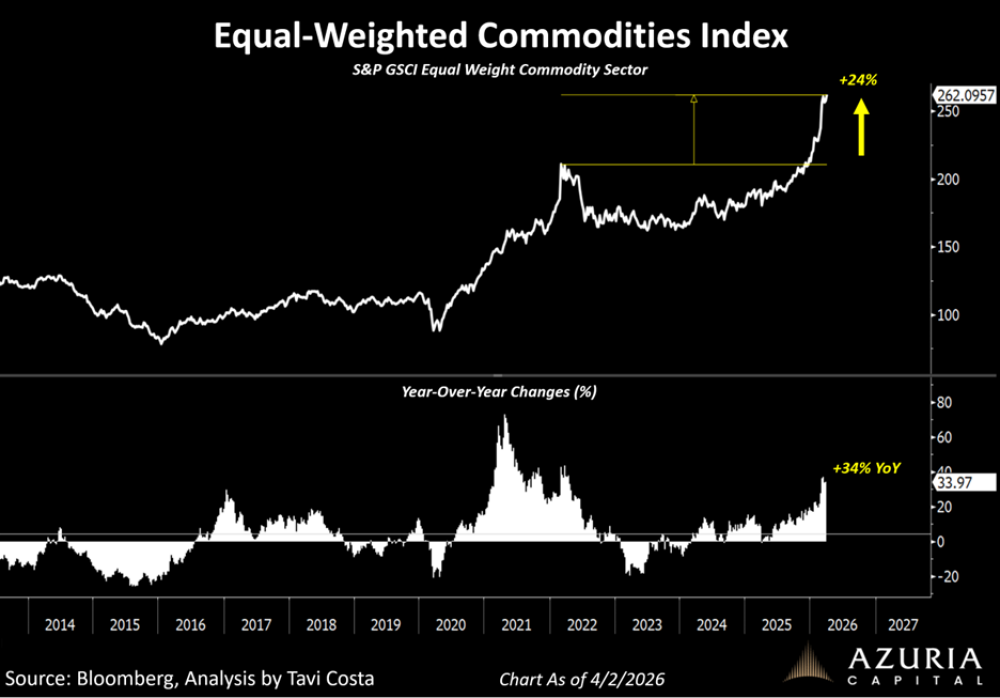 Commodities are now nearly 25% above the highs reached during the peak of the Russia-Ukraine war. The equal-weighted commodity index is rising at an annualized pace of roughly 34%.