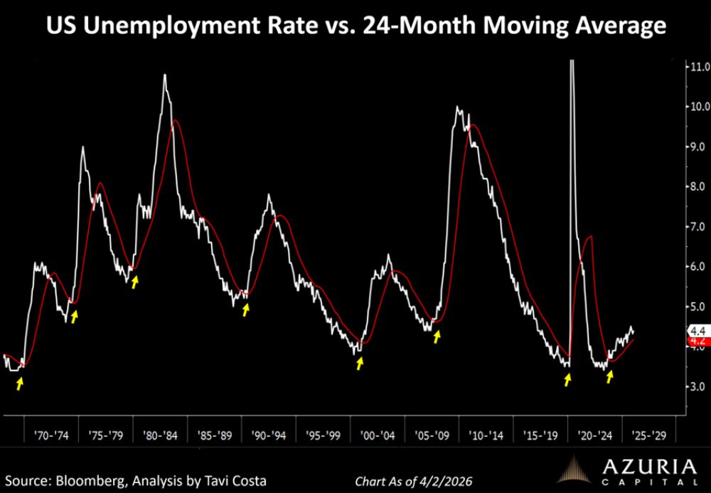 One of the most reliable indicators I track is unemployment relative to its 24-month moving average. When the former crosses above the latter, deterioration tends to accelerate. This has happened every single time since 1970.