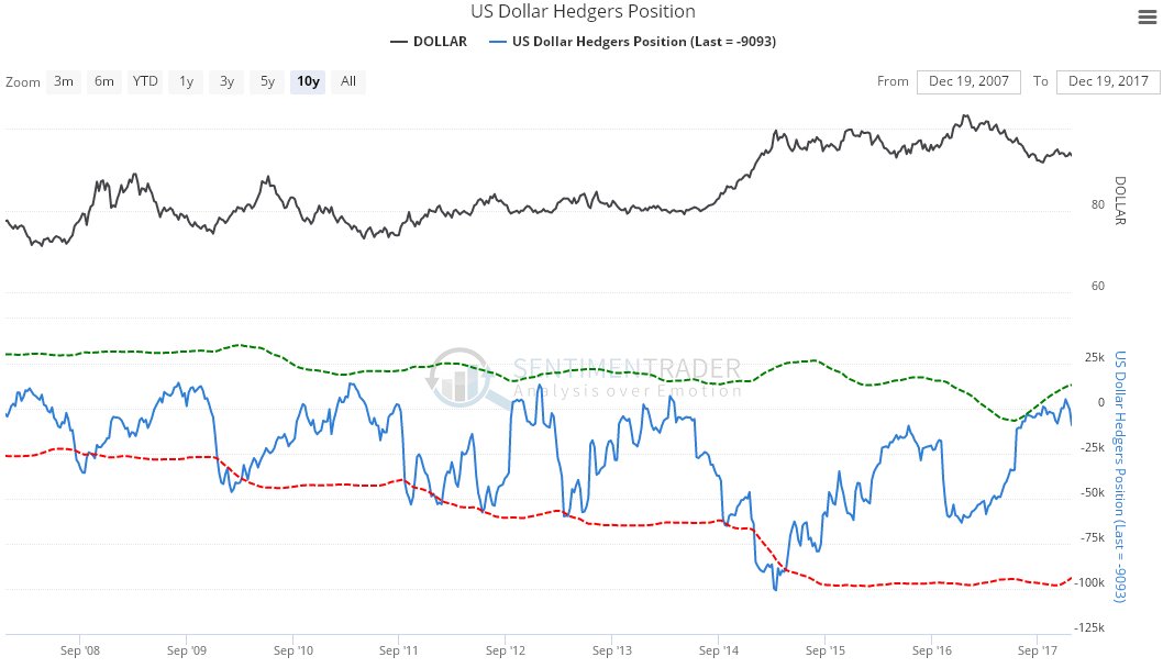 However, there are two opposing factors on the other side of the scales that we must weigh against the bearish looking dollar index chart. One is the latest dollar Hedgers chart, which shows that Hedgers’ positions are at levels that have in the past led to rallies.