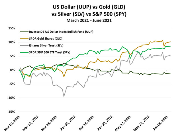 Related ETFs: Invesco DB US Dollar Index Bullish Fund (UUP), Invesco DB US Dollar Index Bearish Fund (UDN), SPDR Gold Shares (GLD), iShares Silver Trust (SLV)