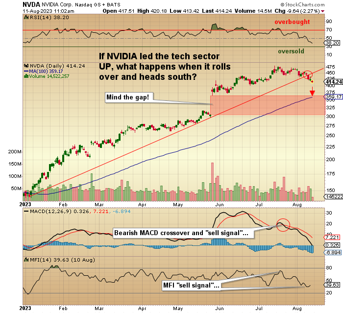 Speaking of chickens coming home to roost, the chart of Nvidia (NVDA:NASDAQ) is beginning to look like the NASDAQ circa 2001 as it is now firmly in correction mode with RSI crashing toward oversold status and both MACD and MFI working "sell signals."