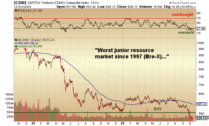 I draw your attention to the benchmark for junior resource stocks — the TSX Venture Exchange — which hit a yearly low on October 5, ironically the same day that gold bottomed under US$1,825.
