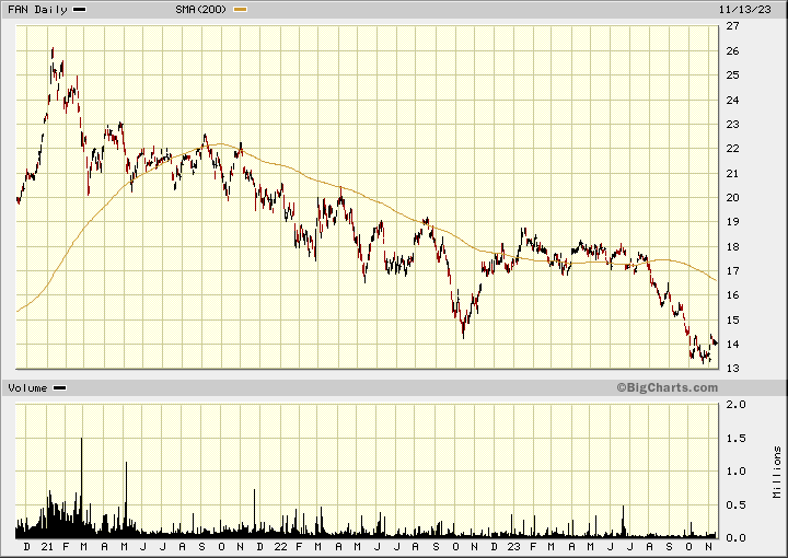 Here are charts of popular wind etf FAN and solar etf TAN: