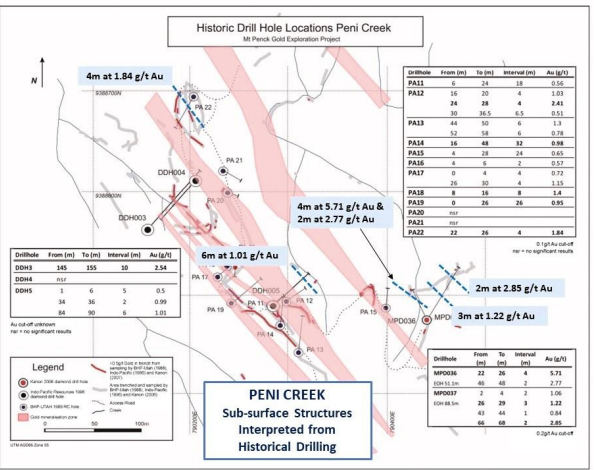 Twelve historical air-core drill holes by BHP-Utah and five diamond holes by others were completed at Peni Creek.