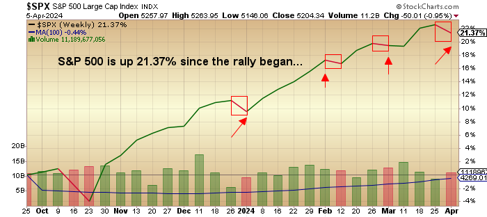 "Last week was one of the few down weeks since the rally in stocks began in late October of last year. It marked the fourth week of the past twenty-four that was down in a period that has been one of the strongest performances for stocks in history."