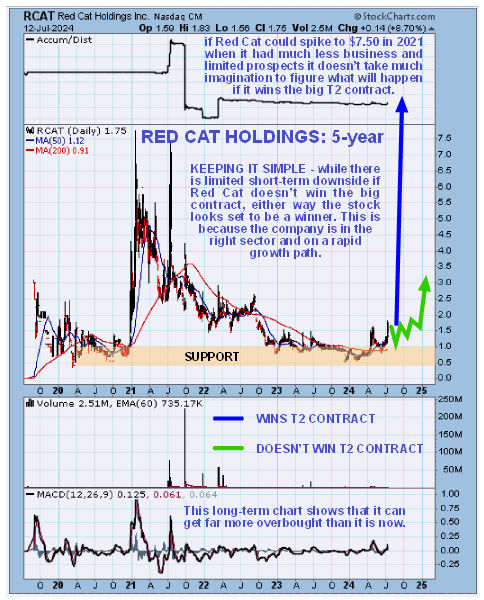 So the conclusion must be that, while Red Cat is to a certain extent a speculation here, especially given that its sharp rise over the past week is due to the prospects of its winning this contract, given that the chances of its winning it are probably better than even it is viewed as a worthwhile speculation and here's the thing — even if it doesn't win this contract its products are in big demand, demand which continues to grow. So, in the event of it not winning the contract, we can expect it to sell off some, but then it should form an intermediate base pattern, gather itself together, and advance anew. If it does win the contract, we can expect it to "go ballistic."