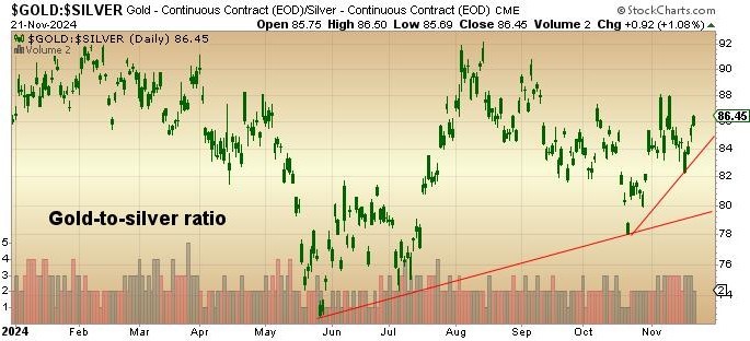 The gold-and-silver ratio ("GSR") has been a fairly reliable tool for confirming advances in the precious metals complex, and as this chart reveals, the advancing GSR certainly does not provide me with a great deal of confidence in the gold rally.