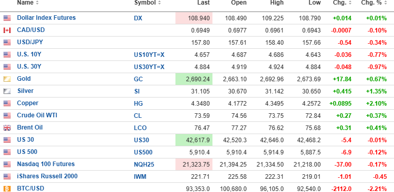 The USD index futures are ahead 0.01% to 108.940 this morning with the 10-year yield down 0.77% to 4.657 and the 30-year yield down 0.97% to 4.884%.