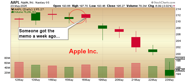 The QQQ:US — the retail trader's proxy for the technology sector and "Mag Seven" leadership — came within 3.4% of its high of $540.81, also registered in the February advance. Alas, on Thursday, the U.S. President uttered the words shown above, sending a large and very threatening cannonball across the bows of the USS Apple (Apple Inc. (AAPL:NASDAQ)), sending stocks careening lower as the "tariff tantrums" returned with a vengeance.