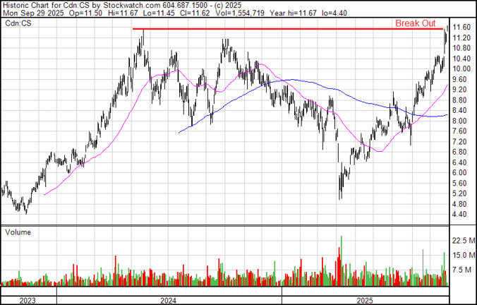 And reported in The Globe, that the National Bank analysts continue to rate Capstone Copper "Outperform." The analysts gave their share target a $2.25 boost to $12. Analysts on average target the shares at $11.38. The stock has recovered from the tariff sell off and is breaking out to new highs today. We are up about 100%, but it is too early for profits.