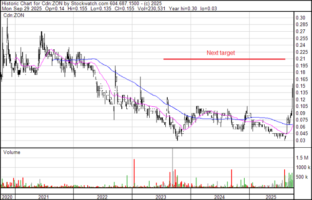 Zonte Metals Inc. (ZON:TSXV; EREPF:OTC) is another copper junior on the move, up about 200% in a month. I had the stock as a Strong Buy to $0.105 because that was technical resistance on the chart. It smashed through that last Thursday. I see the stock as still very cheap and a buy.