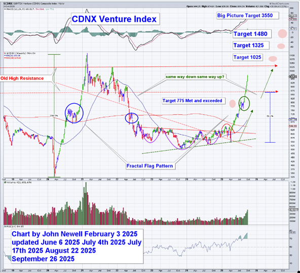 In my earlier article, I argued that the TSX Venture Index (CDNX) was forming a mirror-image reversal "the same way down, the same way up." That pattern has now broken out decisively, clearing the 775 level and validating the first target. The next upside objectives are 1,325 and 1,480, levels that align with the 2021 peak.