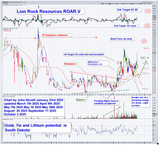 In early October, Lion Rock Resources pushed decisively through its Point of Resistance (POR), what I call "invisible resistance," the level where quiet accumulation gives way to market recognition. This marks the Point of Recognition phase, where the broader market begins to revalue a stock based on new information.