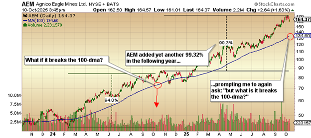 So here I am a year later, and gold is now higher by 46% than it was a year ago when I sat there staring at my computer like a grade-school dropout tormented by multiple failed Pac-Man attempts with AEM up another 99.3% and about to post record earnings and record net free cash flow while posting the lowest AISC of all the majors.