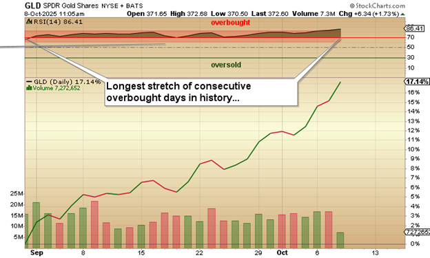 As of last Wednesday, when it peaked at $4,080, GLD:US had remained overbought (RSI above 70) for forty-one (41) consecutive days and had advanced 17.14% in the same time period. This kind of a move, while exhilarating if you are long gold and silver, was absolutely unprecedented. I bought a boatload of GLD:US put options as well as a few shares in JDST:US (Junior Miner "bear" ETF) just to see if "by recalling the past I could possibly profit in the future" (to coin a corny phrase).