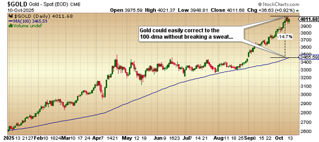 The 100-dma started the year at around $2,625, so if one's knees start shaking at a correction back to $3,465, one should not be in the gold market.