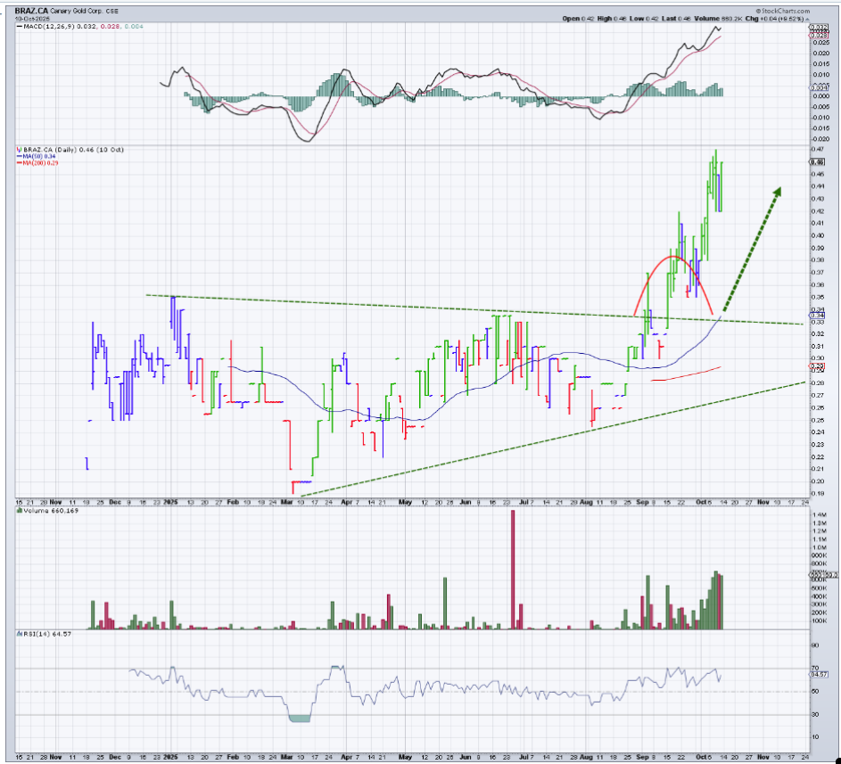 "Canary Gold has recently completed a bullish breakout from a multi-month symmetrical triangle formation, confirming a significant shift in market sentiment. After months of consolidation between roughly CA$0.26 and CA$0.34, the stock pushed decisively through upper resistance in late September on expanding volume, often an early indication of institutional or informed accumulation. Following the breakout, the shares pulled back modestly to test the former resistance zone, now acting as support near CA$0.35, before resuming their advance. This retest strengthens the breakout's validity and sets the stage for a continuation move toward the next resistance levels. Momentum indicators support the bullish outlook. The MACD has crossed firmly into positive territory, and both moving averages are trending upward with increasing separation. The RSI, currently in the low-60s, remains constructive and shows room to advance before reaching overbought levels. Volume patterns reveal clear accumulation, confirming improved investor participation. The measured move from the triangle pattern projects an intermediate-term target near CA$0.60, while the broader structural base suggests a longer-term "big picture" target in the CA$0.75–CA$0.80 range, contingent on sustained volume and favorable sector tailwinds. Overall, the technical picture supports a Speculative Buy for traders and investors seeking exposure to early-stage momentum within the junior gold exploration sector. Continued strength above CA$0.35 would maintain this positive bias, while a close below that level would warrant short-term caution."