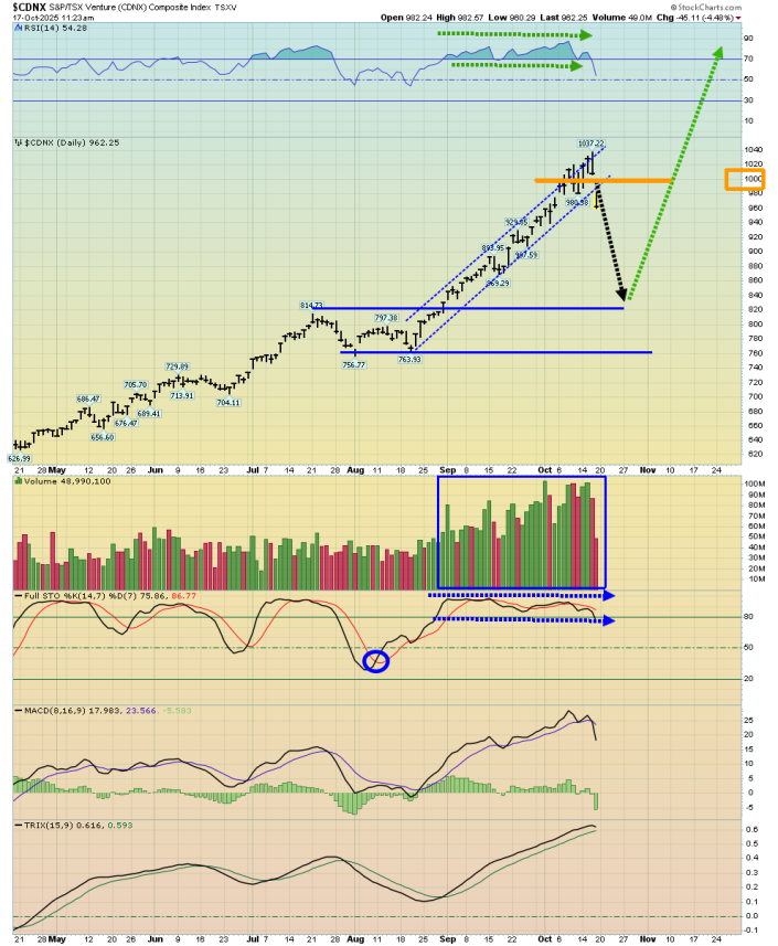 A breakout over 1037 would be a good sign that the CDNX is going surge over the neckline area highs at 1100, likely launching one of the greatest bull runs in the history of markets.