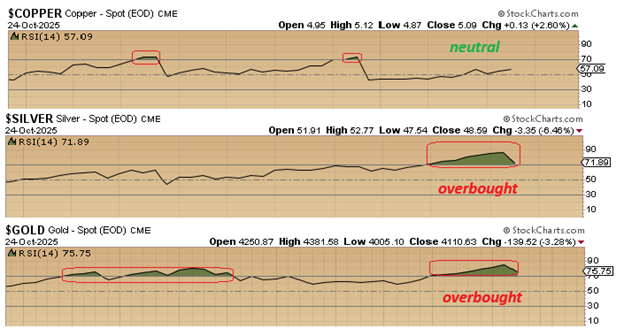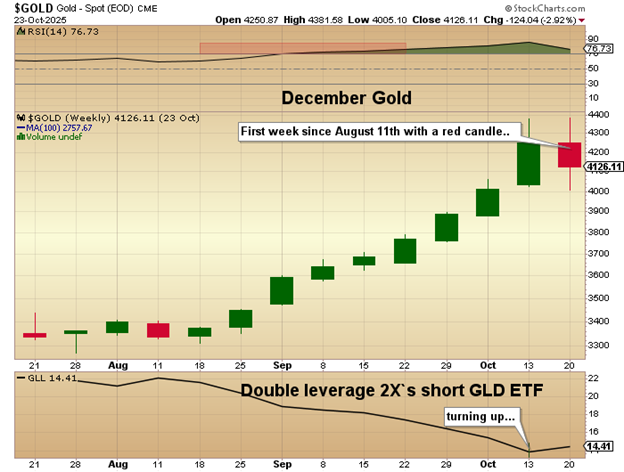 Silver and gold put in the first weekly red candle after nine consecutive "UP" weeks. It spent the better part of September and October in an "overbought" condition and my experience over the years teaches me that it will experience a corrective phase far longer than "two or three days" as many of the pundits have been extolling.