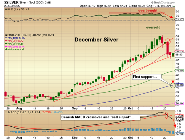 Gold and silver prices closed out the week lower than their closes last Friday, with December gold about $130/ounce below the October 17 close and with silver about $3.50/ounce below its October 17 close. As stated last in last week's missive, the outside key reversal day a week ago was merely a "signal" telling me that the topping "process" had begun.